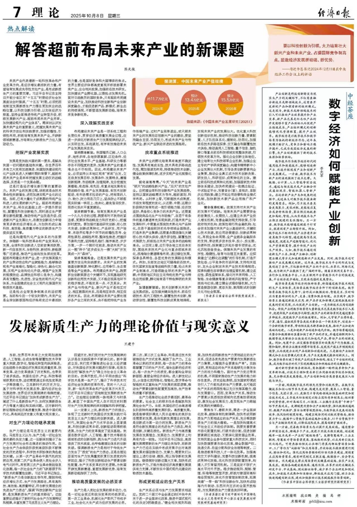 这是打造经济增长新引擎的重要动力。未来产业的发展过程,说到底是由技术革命性突破催生、进而加速实现产业化的过程。当前,已有大量处于成熟期的传统产业和进入成长期的新兴产业。超前布局建设未来产业,将在此基础上进一步提升原创性、颠覆性科技创新能力,同时通过生产要素创新性配置,推动传统产业改造升级、促进新兴产业发展壮大,在激发创新活力中培育更多新的经济增长点,为加快形成以高科技、高效能、高质量为特征的新质生产力提供坚实支撑。
