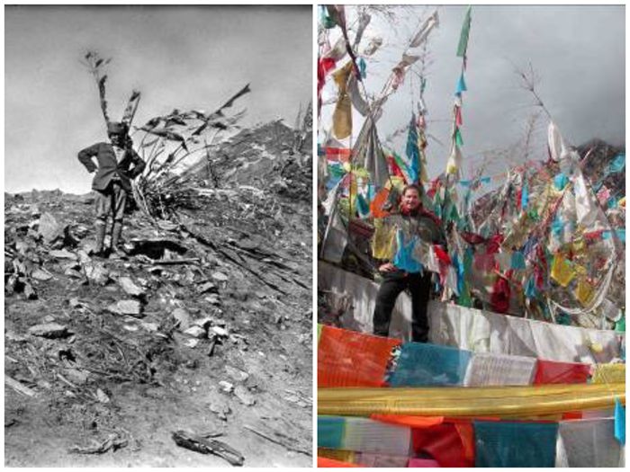 左:1923年洛克在独克拉垭口;右:2003年Bob Mosely 在独克拉垭口。