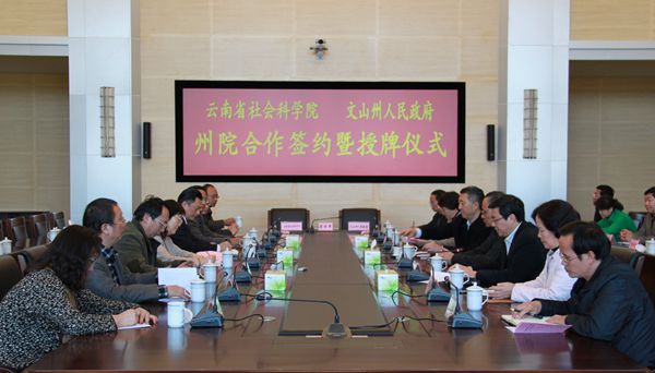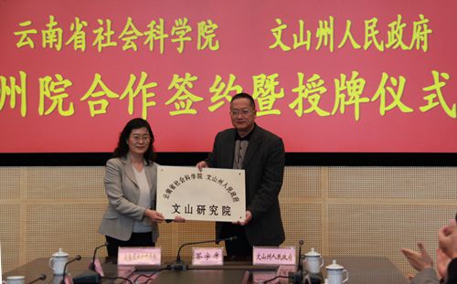 我院党组副书记、院长任佳代表我院与文山州委常委、常务副州长张秀兰签署《云南省社会科学院、文山州人民政府合作协议》,并为云南省社会科学院文山分院授牌合。