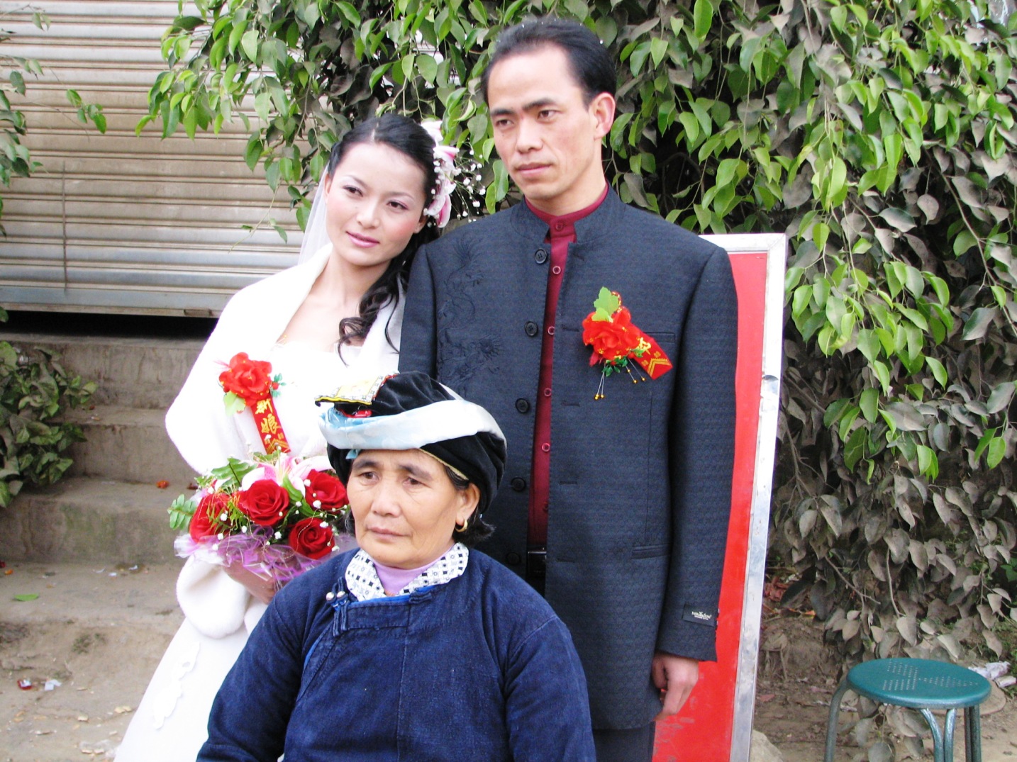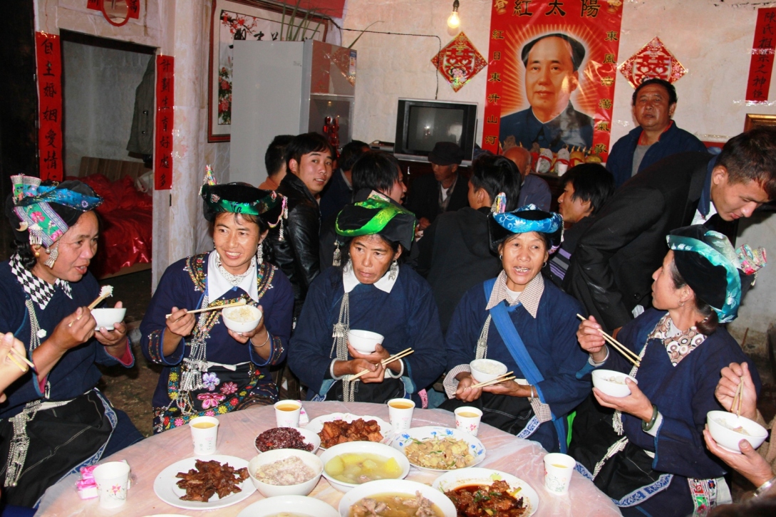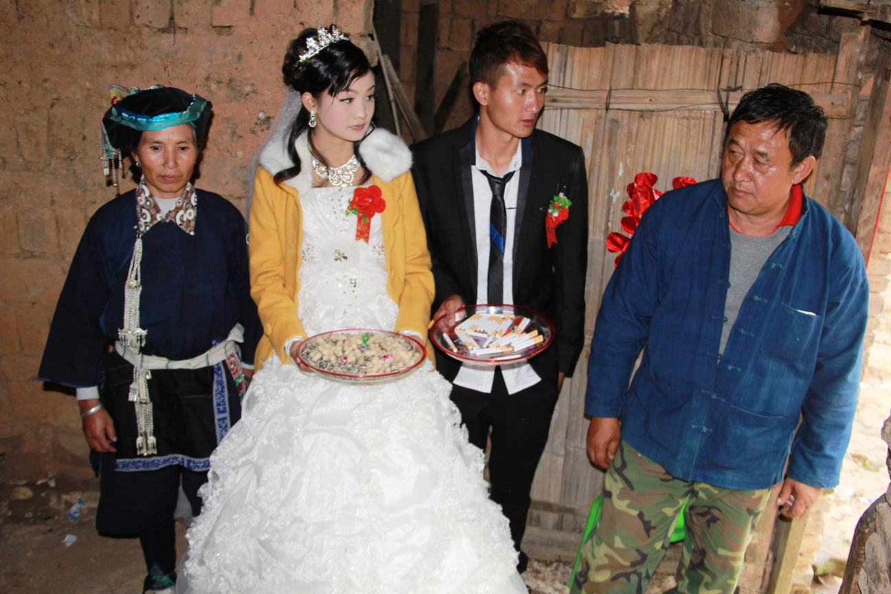迎娶(毫迷固)。男方在迎亲之日,先要挑着糯米粑粑、衣物等礼物到舅舅家去请舅舅帮“挂红";然后,新郎在媒人和最要好的小伙伴的陪同下去女方家迎娶新娘。与新郎同去的青年男女一定要双数,意为成双成对。迎亲队伍到新娘家之后,媒人把带去的礼物摆在供桌上,给女方家长辈清收,所有礼物女方要还给男方六分之一,以示把福禄留一点给男方;尔后媒人拿出六十六元钱给女方,旧时这份钱不论多少,都要用秤称一称,表示双方称心如意,等一切结束之后,新郎才能把新娘迎娶回家。