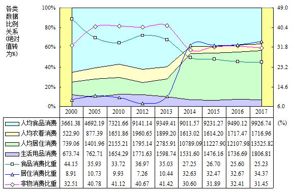 2000年以来,上海居民食品消费比(恩格尔定律关系)持续极显著下降,17年降低16.35个百分点;其与物质消费比之间历年变动相关系数0.1780,亦即17.80%程度同步;物质消费比持续极显著下降,17年降低4.77个百分点。食品消费比重(恩格尔系数)持续极显著下降,17年降低18.92个百分点;居住消费比重持续极显著上升,17年升高25.46个百分点;二者历年变动相关系数-0.8792,亦即87.92%程度逆反,后者升高“进占”比重反而明显超过前者降低“退让”比重,最终导致非物消费比重跌降之“消费结构逆升级”。
