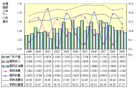 2000~2017年广东增长相关系数:非物消费与产值之间0.28,相关性甚微;与居民收入之间0.56,相关性很低;与居民积蓄之间-0.08,扩大回溯20年间1997~2013年-0.71,2001~2006年-0.95,负相关性显著,二者曲线呈峰谷对应水中倒影。非物消费比(占收入比)前5年极显著上升,后12年极显著下降,17年降低2.51个百分点;非物消费比重(占总消费比)前5年极显著上升,后12年极显著下降,17年降低1.27个百分点。非物消费城乡比前7年极显著扩大,后10年极显著缩小,17年缩减33.74%;地区差持续显著缩小,17年缩减44.98%。这些动态体现由衣食温饱“基本小康”到相对富余“全面小康”的“人民美好生活需要”变化。