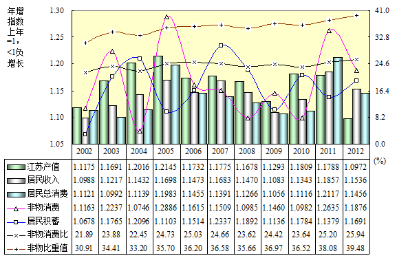 2000~2017年江苏增长相关系数:非物消费与产值之间0.46,相关性很低;与居民收入之间0.47,相关性很低;与居民积蓄之间0.01,其间2003~2013年-0.51,2004~2008年-0.78,负相关性明显,二者曲线呈峰谷对应水中倒影。非物消费比(占收入比)前12年极显著上升,后5年显著下降,17年升高2.55个百分点;非物消费比重(占总消费比)前13年极显著上升,近4年极显著下降,17年升高6.42个百分点。非物消费城乡比前5年较明显扩大,后12年显著缩小,17年缩减34.92%;地区差前12年较明显扩大,后5年略微缩小,17年扩增3.70%。这些动态体现由衣食温饱“基本小康”到相对富余“全面小康”的“人民美好生活需要”变化。