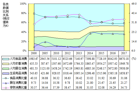 2000年以来,天津居民食品消费比(恩格尔定律关系)持续极显著下降,17年降低5.58个百分点;其与物质消费比之间历年变动相关系数0.3622,亦即36.22%程度同步;物质消费比前14年极显著上升,近3年极显著下降,17年降低1.17个百分点。食品消费比重(恩格尔系数)持续极显著下降,17年降低9.04个百分点;居住消费比重前14年极显著上升,近3年较明显下降,17年升高11.54个百分点;二者历年变动相关系数-0.8592,亦即85.92%程度逆反,后者升高“进占”比重反而明显超过前者降低“退让”比重,否则非物消费比重提升之“消费结构升级”更加显著。