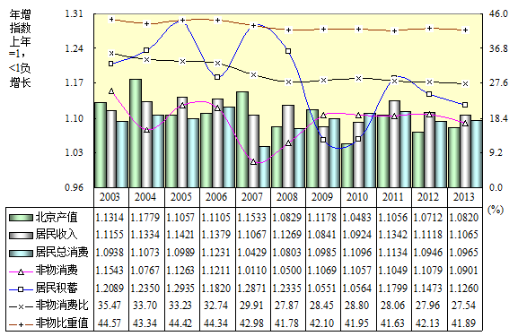 2000~2017年北京增长相关系数:非物消费与产值之间0.24,相关性甚微;与居民收入之间-0.44,相关性逆反;与居民积蓄之间-0.27,扩大回溯20年间1997~2013年-0.62,2002~2006年-0.91,负相关性显著,二者曲线呈峰谷对应水中倒影。非物消费比(占收入比)前3年极显著上升,后14年极显著下降,17年降低5.68个百分点;非物消费比重(占总消费比)前3年极显著上升,后14年极显著下降,17年降低0.32个百分点。非物消费城乡比前3年明显扩大,后14年显著缩小,17年缩减13.23%;地区差前3年明显扩大,后14年极显著缩小,17年缩减36.09%。这些动态体现由衣食温饱“基本小康”到相对富余“全面小康”的“人民美好生活需要”变化。