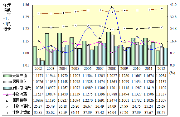 2000~2017年天津增长相关系数:非物消费与产值之间0.25,相关性甚微;与居民收入之间0.49,相关性很低;与居民积蓄之间0.58,扩大回溯20年间1997~2013年-0.54,2007~2011年-0.99,负相关性显著,二者曲线呈峰谷对应水中倒影。非物消费比(占收入比)前5年极显著上升,后12年较明显下降,17年升高4.20个百分点;非物消费比重(占总消费比)前13年极显著上升,近4年极显著下降,17年升高4.36个百分点。非物消费城乡比前10年极显著扩大,后7年极显著缩小,17年缩减37.27%;地区差前1年略微扩大,后16年明显缩小,17年缩减18.46%。这些动态体现由衣食温饱“基本小康”到相对富余“全面小康”的“人民美好生活需要”变化。