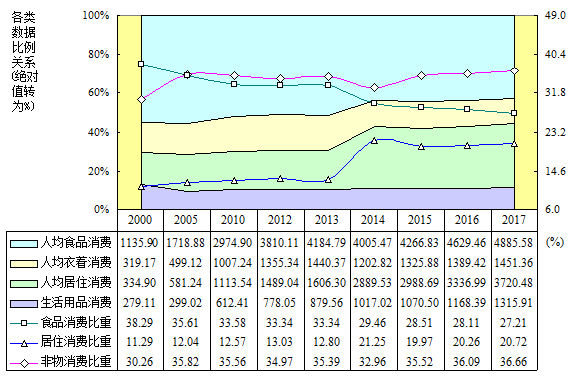 2000年以来,山东居民食品消费比(恩格尔定律关系)持续极显著下降,17年降低10.52个百分点;其与物质消费比之间历年变动相关系数0.8945,亦即89.45%程度同步;物质消费比持续极显著下降,17年降低10.34个百分点。食品消费比重(恩格尔系数)持续极显著下降,17年降低11.08个百分点;居住消费比重前14年极显著上升,近3年较明显下降,17年升高9.43个百分点;二者历年变动相关系数-0.9344,亦即93.44%程度逆反,后者升高“进占”比重很大程度填满前者降低“退让”比重,否则非物消费比重提升之“消费结构升级”更加显著。