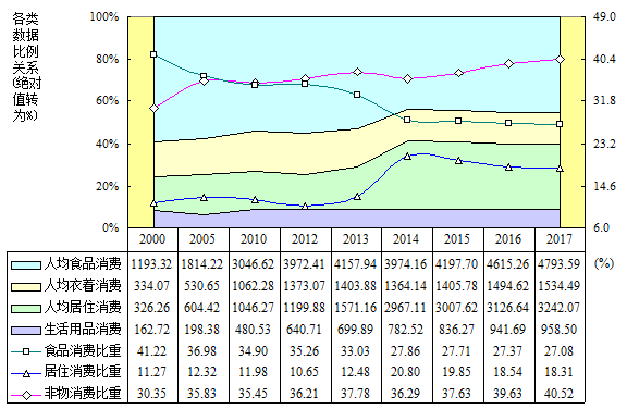 2000年以来,东北居民食品消费比(恩格尔定律关系)持续极显著下降,17年降低12.59个百分点;其与物质消费比之间历年变动相关系数0.9130,亦即91.30%程度同步;物质消费比持续极显著下降,17年降低11.23个百分点。食品消费比重(恩格尔系数)持续极显著下降,17年降低14.14个百分点;居住消费比重前14年极显著上升,近3年显著下降,17年升高7.04个百分点;二者历年变动相关系数-0.8906,亦即89.06%程度逆反,后者升高“进占”比重一定程度填补前者降低“退让”比重,否则非物消费比重提升之“消费结构升级”更加显著。