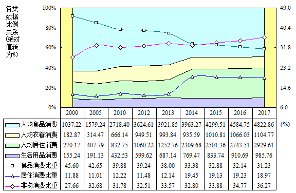 2000年以来,西部居民食品消费比(恩格尔定律关系)持续极显著下降,17年降低14.17个百分点;其与物质消费比之间历年变动相关系数0.9391,亦即93.91%程度同步;物质消费比持续极显著下降,17年降低12.06个百分点。食品消费比重(恩格尔系数)持续极显著下降,17年降低14.37个百分点;居住消费比重前14年极显著上升,近3年略微下降,17年升高7.09个百分点;二者历年变动相关系数-0.9065,亦即90.65%程度逆反,后者升高“进占”比重一定程度填补前者降低“退让”比重,否则非物消费比重提升之“消费结构升级”更加显著。