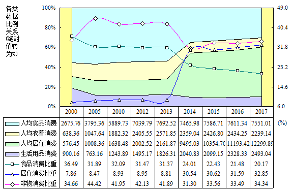 2000年以来,北京居民食品消费比(恩格尔定律关系)持续极显著下降,17年降低16.43个百分点;其与物质消费比之间历年变动相关系数0.2276,亦即22.76%程度同步;物质消费比持续极显著下降,17年降低10.10个百分点。食品消费比重(恩格尔系数)持续极显著下降,17年降低16.32个百分点;居住消费比重持续极显著上升,17年升高24.99个百分点;二者历年变动相关系数-0.9555,亦即95.55%程度逆反,后者升高“进占”比重反而大大超越前者降低“退让”比重,最终导致非物消费比重跌降之“消费结构逆升级”。