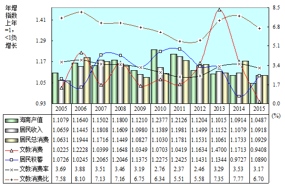 回溯20年检测海南增长相关系数:文教消费与产值之间0.03,相关性甚微,文教消费率(与产值比)前5年明显上升,后15年明显下降,20年降低0.17个百分点;与居民收入之间0.21,相关性甚微,文教消费比(占收入比)前5年明显上升,后15年明显下降,20年升高0.13个百分点;与居民积蓄之间-0.34,其间1997~2012年-0.62,2002~2006年-0.94,负相关性显著,二者曲线呈峰谷对应水中倒影。文教消费比重(占总消费比)前5年显著上升,后15年明显下降,20年升高1.11个百分点。文教消费年均增长高于居民收入年增0.09个百分点,高于总消费年增0.57个百分点,高于其余(非文)消费年增0.64个百分点。
