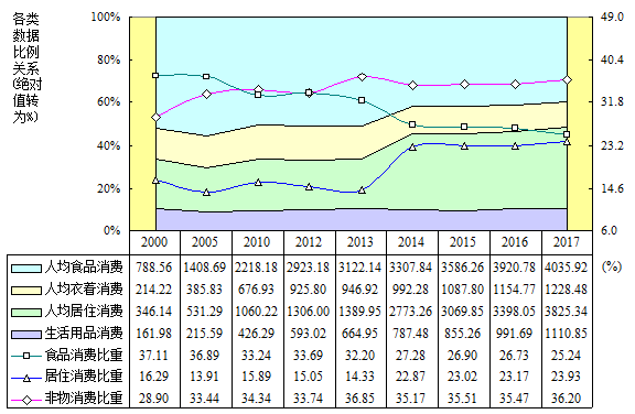2000年以来,河北居民食品消费比(恩格尔定律关系)前4年明显上升,后13年极显著下降,17年降低5.99个百分点;其与物质消费比之间历年变动相关系数0.1644,亦即16.44%程度同步;物质消费比前14年略微上升,近3年较明显下降,17年降低0.49个百分点。食品消费比重(恩格尔系数)前4年明显上升,后13年极显著下降,17年降低11.87个百分点;居住消费比重持续极显著上升,17年升高7.64个百分点;二者历年变动相关系数-0.9037,亦即90.37%程度逆反,后者升高“进占”比重较大程度填充前者降低“退让”比重,否则非物消费比重提升之“消费结构升级”更加显著。