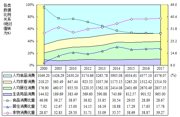 2000年以来,青海居民食品消费比(恩格尔定律关系)持续极显著下降,17年降低15.03个百分点;其与物质消费比之间历年变动相关系数0.7843,亦即78.43%程度同步;物质消费比持续极显著下降,17年降低8.77个百分点。食品消费比重(恩格尔系数)持续极显著下降,17年降低18.31个百分点;居住消费比重前14年极显著上升,近3年明显下降,17年升高9.86个百分点;二者历年变动相关系数-0.9177,亦即91.77%程度逆反,后者升高“进占”比重较大程度填充前者降低“退让”比重,否则非物消费比重提升之“消费结构升级”更加显著。