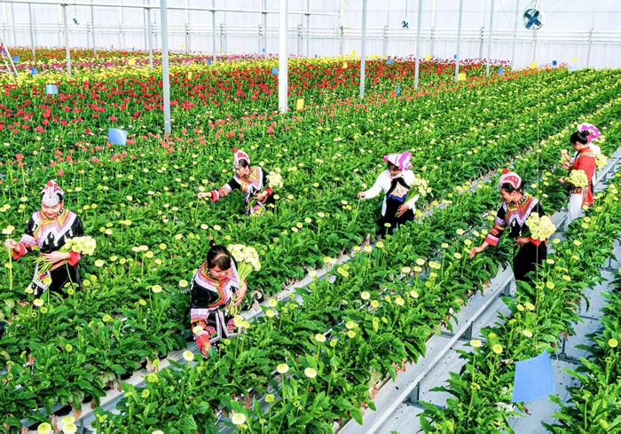 开远市羊街乡黑泥地社区群众在园区花企务工。图源:“开远统战”微信公众号