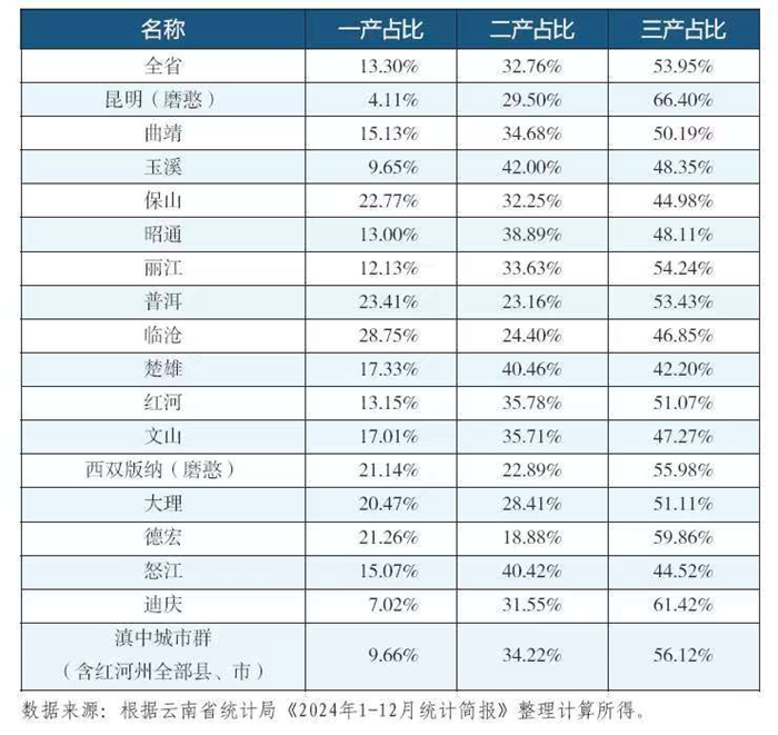 二是城市群产业结构不优,高附加值产业较少。从滇中城市群来看,2024年滇中城市群GDP(含红河州全部县、市)占全省的61.96%,其中昆明市就占26.24%,占比较大,城市首位度较高。表1中计算了各州市三次产业占比情况,集中反映出昆明及各副中心城市产业结构不平衡。统计数据显示,2024年昆明市三次产业结构占比为4∶29∶66,曲靖市是15∶35∶50,玉溪市是10∶42∶48,楚雄州是17∶40∶42,红河州是13∶36∶51。相比同时期全省三次产业结构为13∶33∶54,全国为7∶37∶56,昆明市第二产业占比过低,其余副中心城市占比又过大,第三产业及生产性服务业成长缓慢。滇中城市群内部产业结构不优,新旧动能转换困难。昆明市发展虽然是“一枝独秀”,但是城市群内部产业结构平衡性不足,并且昆明、曲靖、玉溪等不同程度地存在依赖传统产业,产业升级转型慢、路径依赖特征明显。新兴产业培育多为单点突破,与国内发展较为成熟的城市群相比仍有较大差距。
