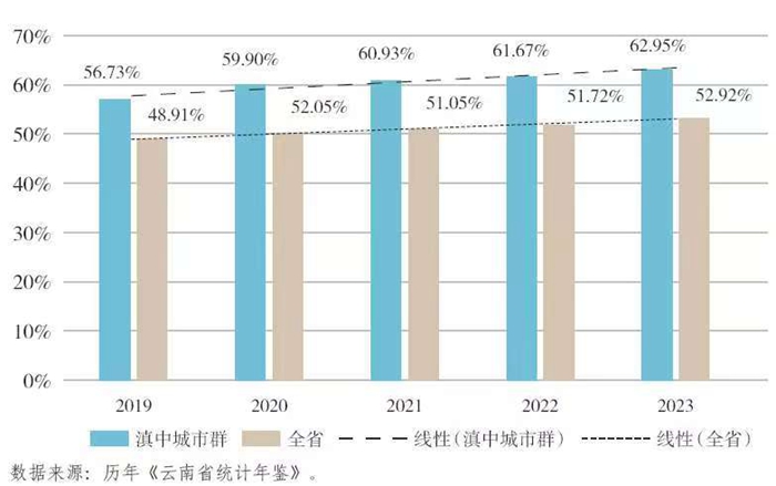 城市群的人口聚集量逐步提高,城市体系初步形成。2024年滇中城市群(含红河州全部县、市)总人口为2199.16万人,全省常住人口为4655万人,已占全省人口的47.24%。在“强省会”战略的实施下,作为省会城市的昆明,城市首位度持续提高已成为全省经济发展的龙头。2024年滇中城市群(含红河州全部县、市)地区GDP为19538.93亿元,占全省的61.96%。分城市来看,昆明市占全省的26.24%,曲靖占全省的11.66%;玉溪占全省的8.19%,楚雄占全省的6.40%,红河(含红河州全部县、市)占全省9.47%。滇中城市群已形成一个特大城市(昆明)、一个大城市(曲靖),一个中等城市(玉溪)、一个托管的口岸(磨憨)城市以及一系列中小城镇构成的城市群。图1为近5年根据统计年鉴数据测算的滇中城市人口城镇化率,反映出近5年来滇中城市群人口城镇化率持续提升。